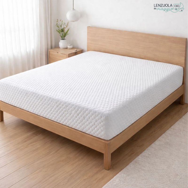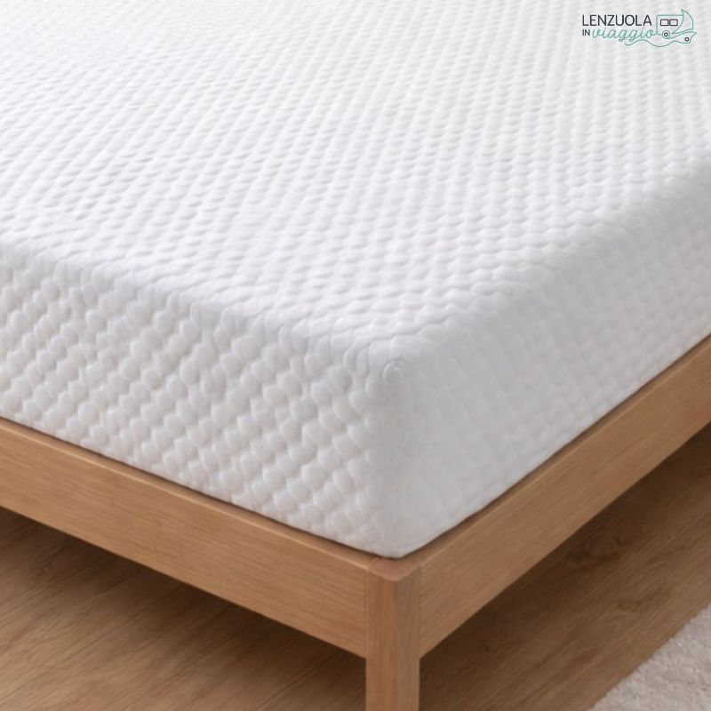 Coprimaterasso con elastico perimetrale continuo, realizzato in tessuto Bubble massaggiante. Realizzabile su misura in qualsiasi forma (sagomato, rotondo o rettangolare) e per ogni spessore di materasso.