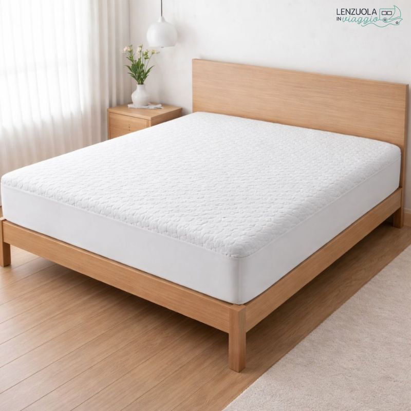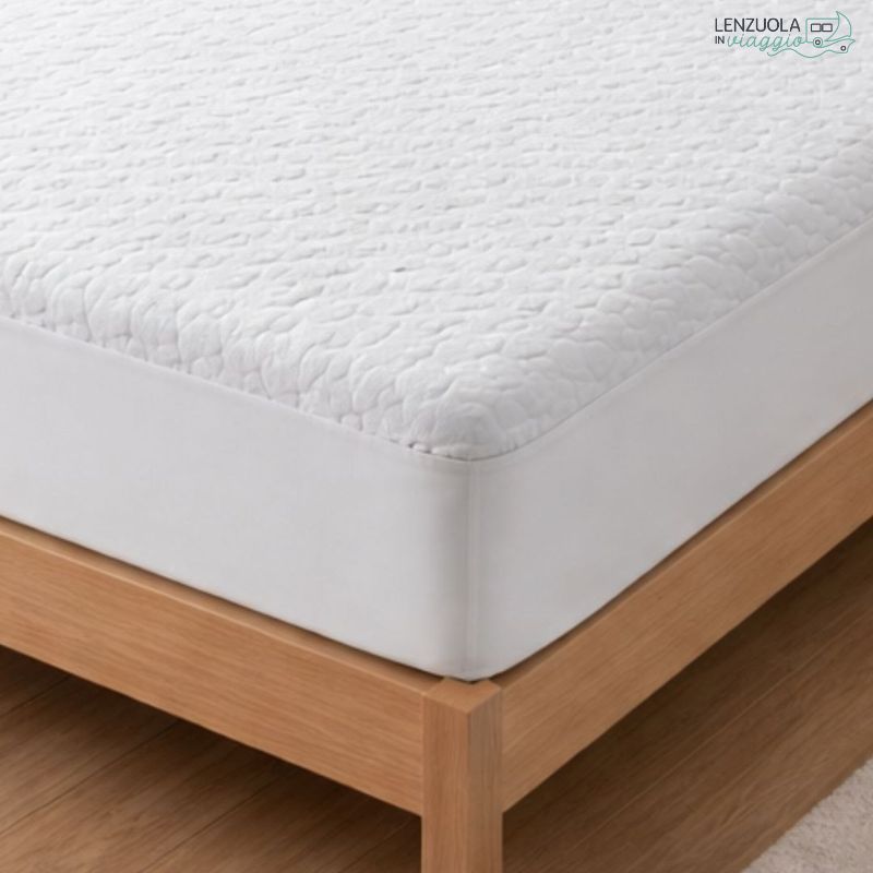 Coprimaterasso con elastico perimetrale continuo, realizzato in tessuto Spugna Jaquard sulla superficie e cotone sulla banda. Realizzabile su misura in qualsiasi forma (sagomato, rotondo o rettangolare) e per ogni spessore di materasso.