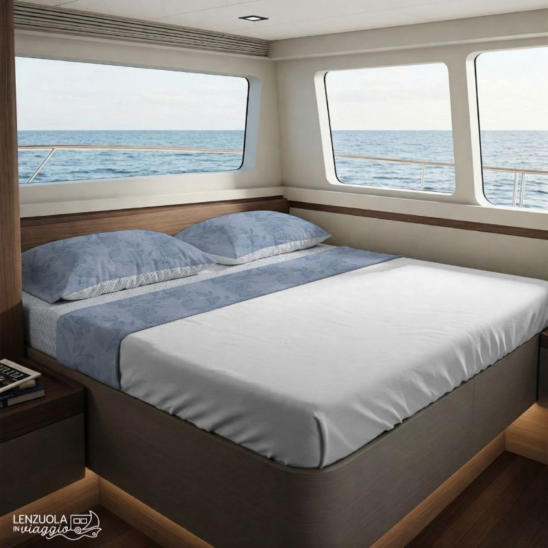 Il completo lenzuola per barca e camper Lilly è composto da un lenzuolo piano con rifinitura cordonetto, un lenzuolo con angoli con elastico tutto giro per avvolgere al meglio il materasso e federe con bottoni, tutto in 100% cotone.